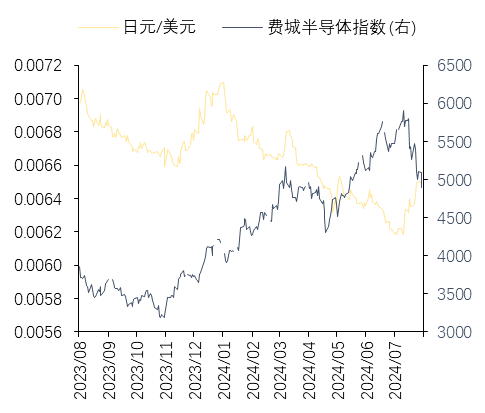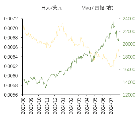 7月11日日本央行下场干预汇率后日元与美股走势呈现非常显著的负相关,因此我们不得不认为前两周美股特别是AI概念的抛售完全是借日元的资金为了尽快平负债头寸而进行的止盈。今天日本央行决定加息15bps,更是超过了0bps的共识。今日亚洲早盘日元掉期尤其是近月有明显的上升,日元现汇也持续上涨。这些意味着过去很多年来依靠借日元炒美股的资金还会继续止盈。
