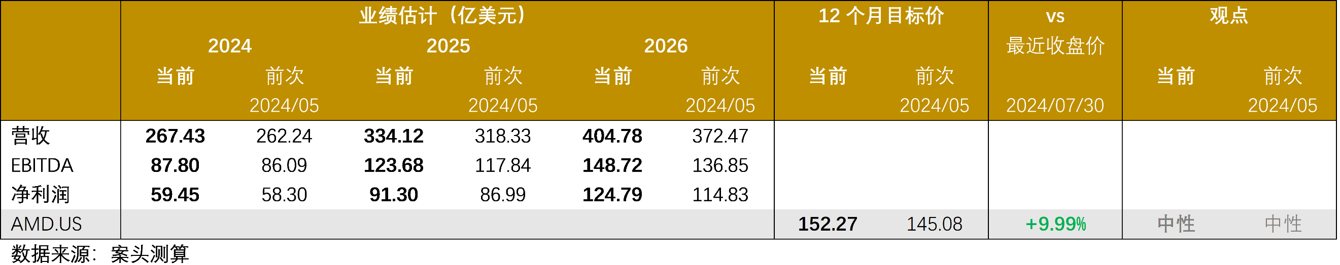 管理层上调了全年指引,特别是将24年数据中心GPU收入预期从上次的40亿美元上调至45亿美元。我们觉得应该是指向Instinct系列计算卡持续上量。管理层承诺加快新GPU推出节奏即每年一代。我们仍然不认为客户会选择现阶段的MI系列取代nVidia的Blackwell。它应该仍然会继续充当一个Plan B的并行系统。另一方面传统需求方面喜忧参半,管理层预计集成卡和定制卡已走出底部、将在下半年逐步回升;同时预计游戏卡将在3Q24有双位数下降。因此整体上我们觉得整体业务是沿着景气回升的方向在展开,并且步伐上应该也与我们前次预期的相去不远,改善是U型而非V型。我们相应对财务预期有一定上调。